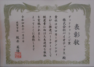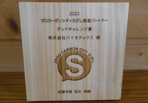 弊社は令和4年6月に「ゼロカーボンシティさがし推進パートナー」の認定を受けましたが、脱炭素に向けた先進的な取組が評価され11月10日に「グッドチャレンジ賞」を受賞しました。